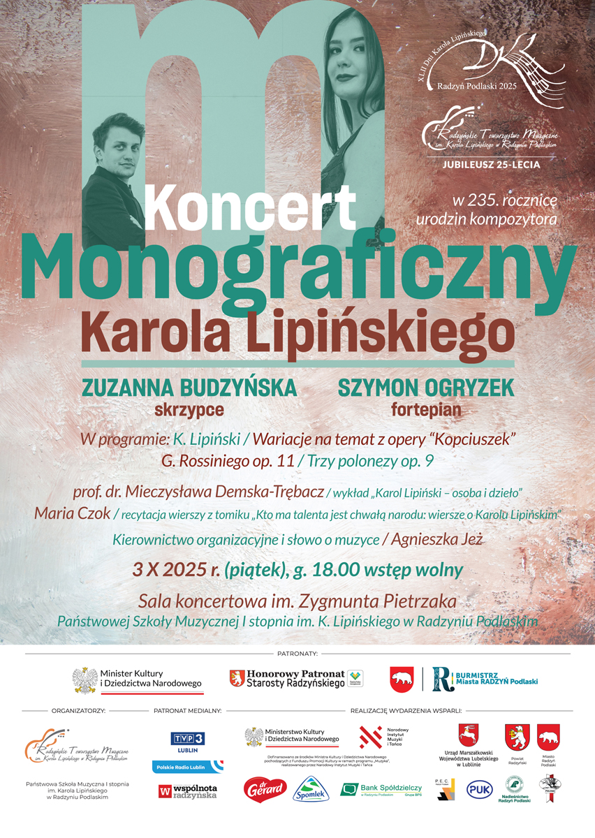 Prof. dr. Mieczysława Demska-Trębacz, prof. emeryt. Uniwersytetu Muzycznego F. Chopina w Warszawie, muzykolog, autorka licznych publikacji naukowych, wygłosi wykład „Karol Lipiński – osoba i dzieło”, a utwory kompozytora wykonają Zuzanna Budzyńska – skrzypce i Szymon Ogryzek – fortepian.